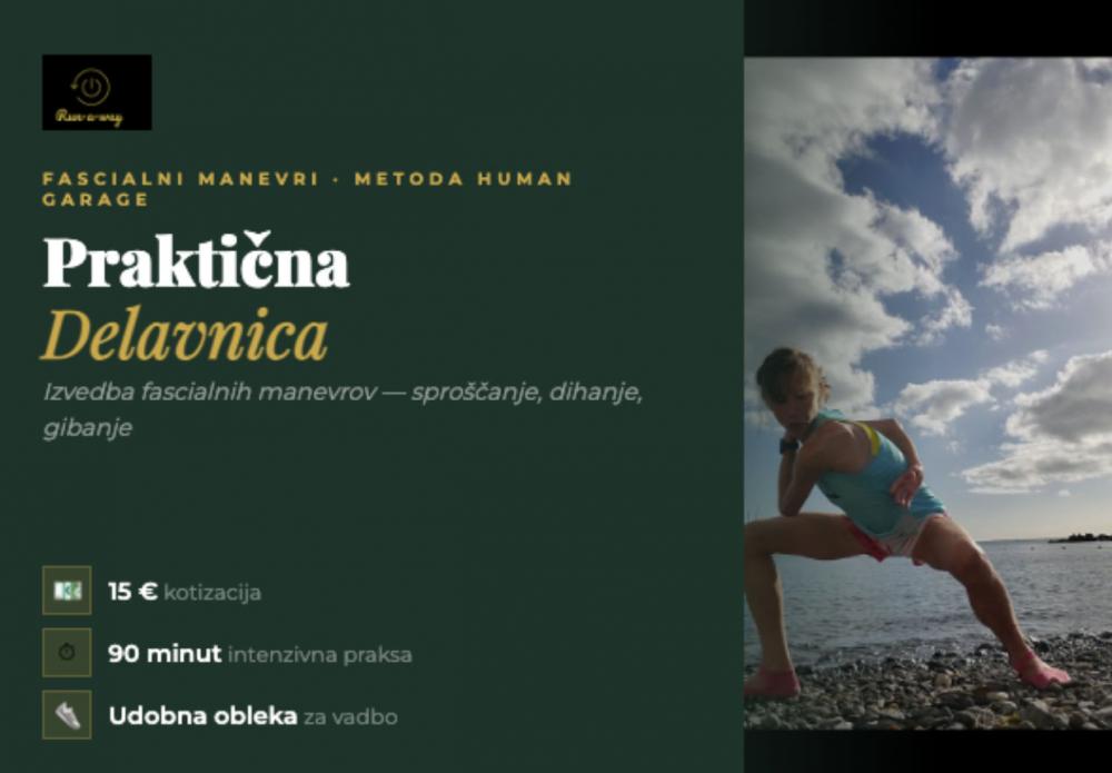 Fascija je vezivno tkivo, ki obdaja vsako mišico, kost, živec in organ — en sam nepretrgan sistem od glave do pet. Shranjuje stres, travme in čustvene napetosti. Na delavnici se boš naučila konkretnih manevrov metode Human Garage: rotacijska gibanja s kombinacijo zavestnega dihanja, ki fascijo sprostijo z notranje strani.